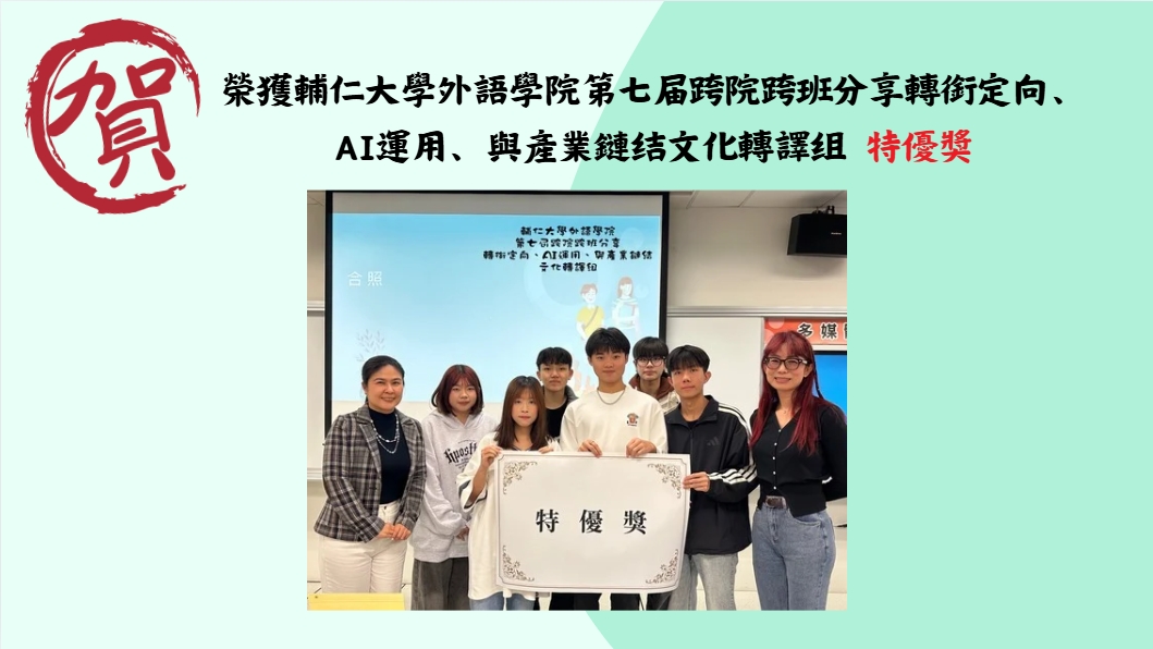 賀榮獲輔仁大學外語學院第七届跨院跨班分享轉銜定向、AI運用、與產業鏈结文化轉譯组特優獎