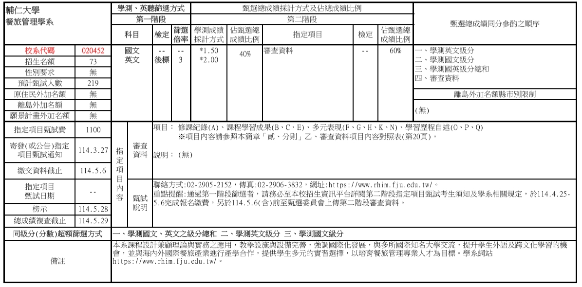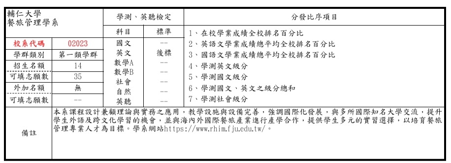 餐旅管理學系自2002年成系以來,每年招生二班學生共110人(另增收陸生、僑生和外籍生),規劃「基礎核心」、「餐飲管理」、「餐飲製備」、「旅宿管理」及「整合課程」等核心課程,輔以實務運用資訊能力、語文能力及實習以強化課程設計。