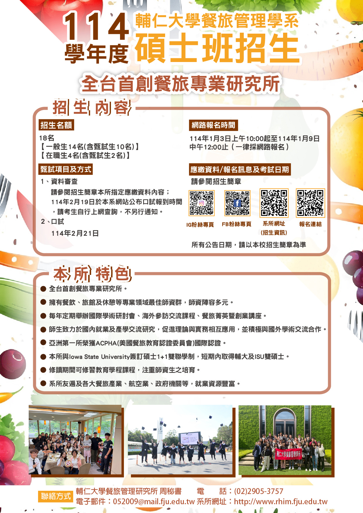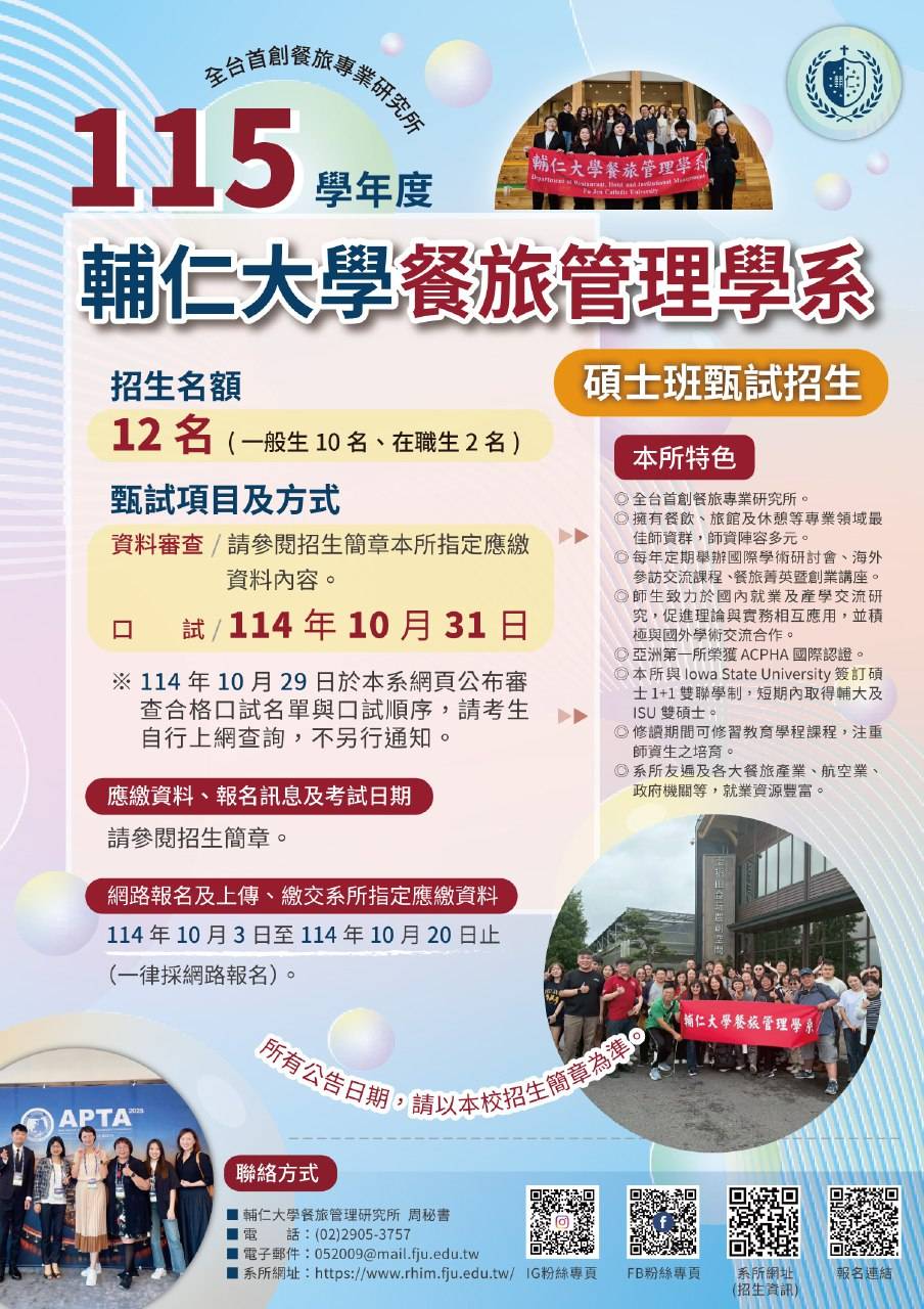 本系碩士班為國內首創的餐旅管理研究所碩士班(每年招收18人),其為延伸大學基礎課程,培育質量兼具的多元餐旅人才,結合產業需求,發展出「餐旅產業創新及文化」及「餐旅進階管理核心課程」,分為餐飲經營管理、旅館經營管理及服務業管理而發展出三大方向,課程設計依課程結構內涵區分為必修課程10 學分,專業選修課程20 學分,總計必須修習30 學分。另計碩士論文6 學分,合計畢業學分為36 學分。
