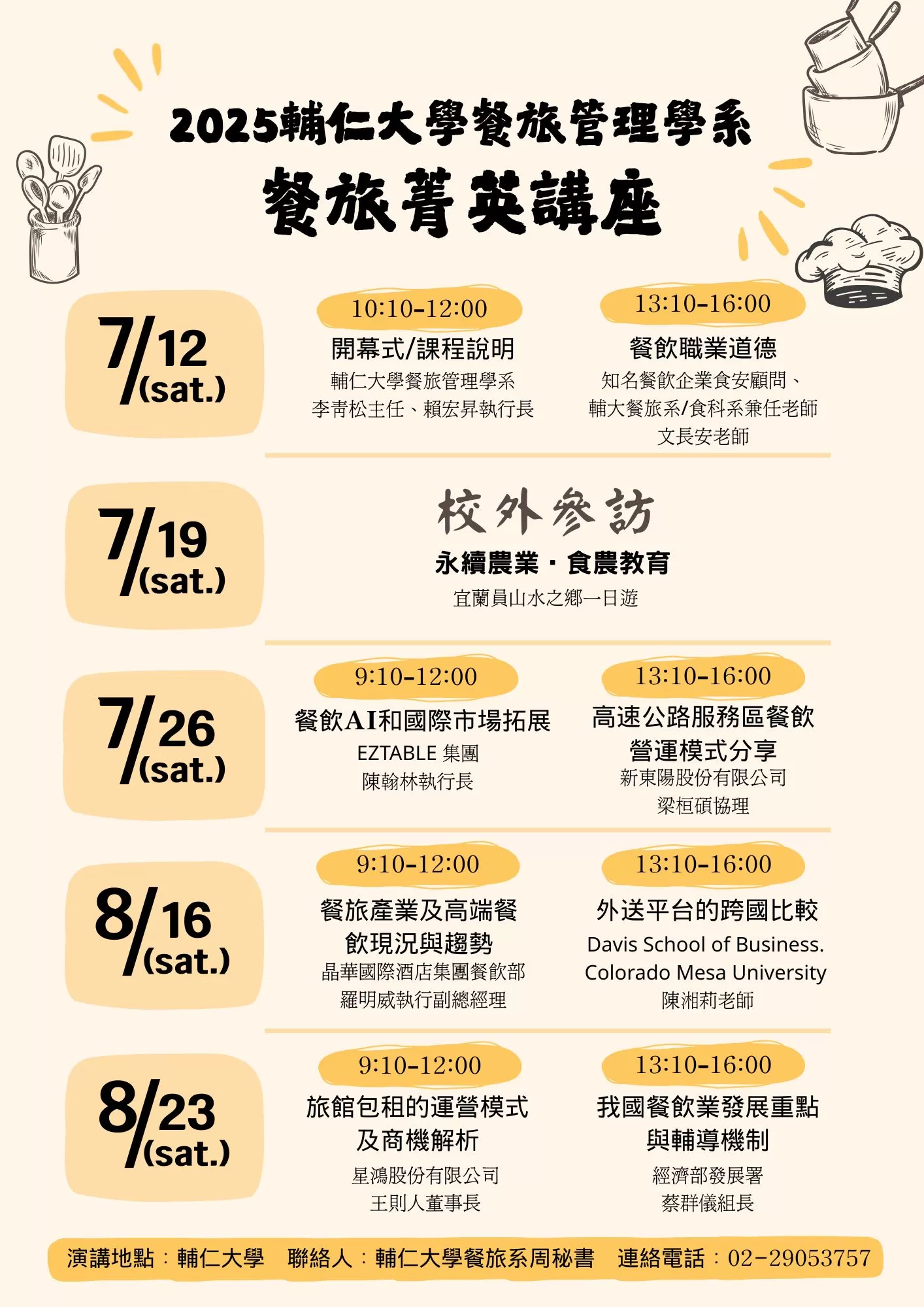 每學年度上學期本系碩士在職專班開設餐旅菁英講座或餐旅創業講座2學分選修課程,歡迎本系碩專班及碩士班學生選修。